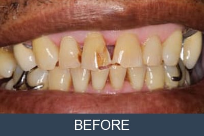 Close-up of a person's smile before dental treatment, showing severe discoloration, wear, and uneven teeth.